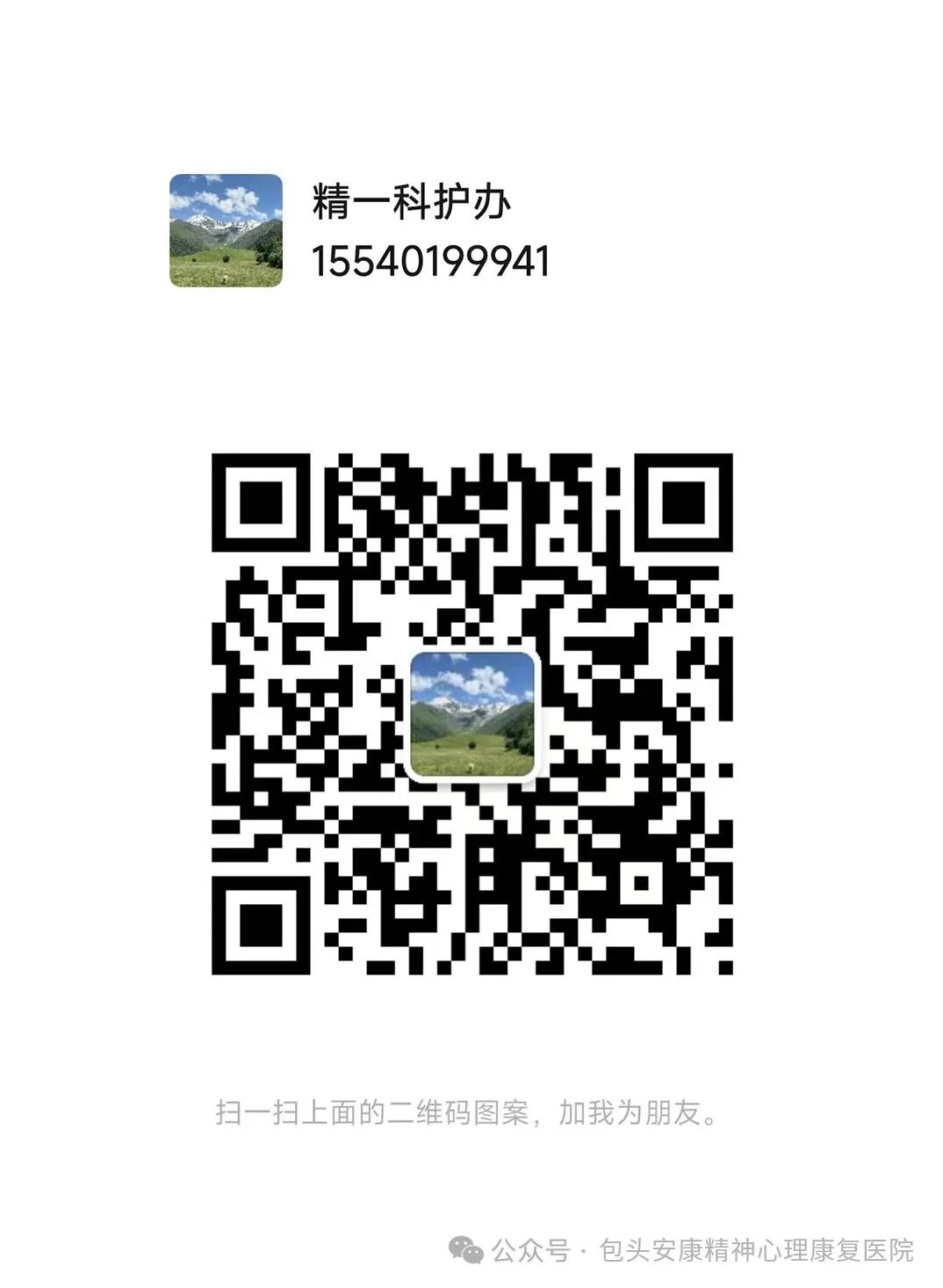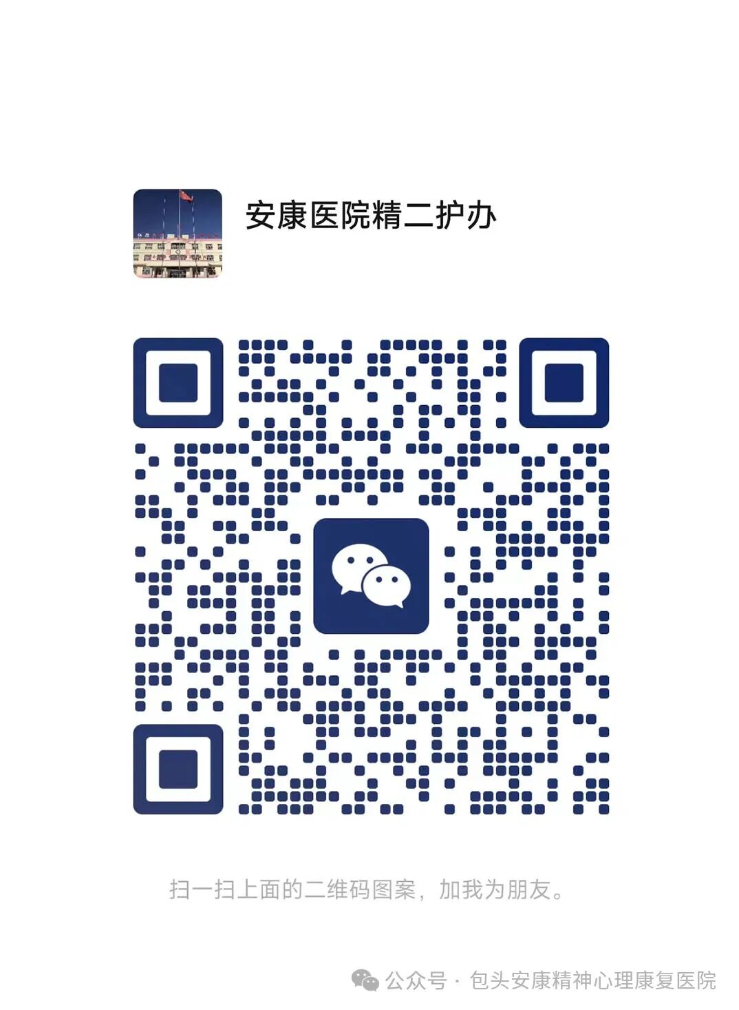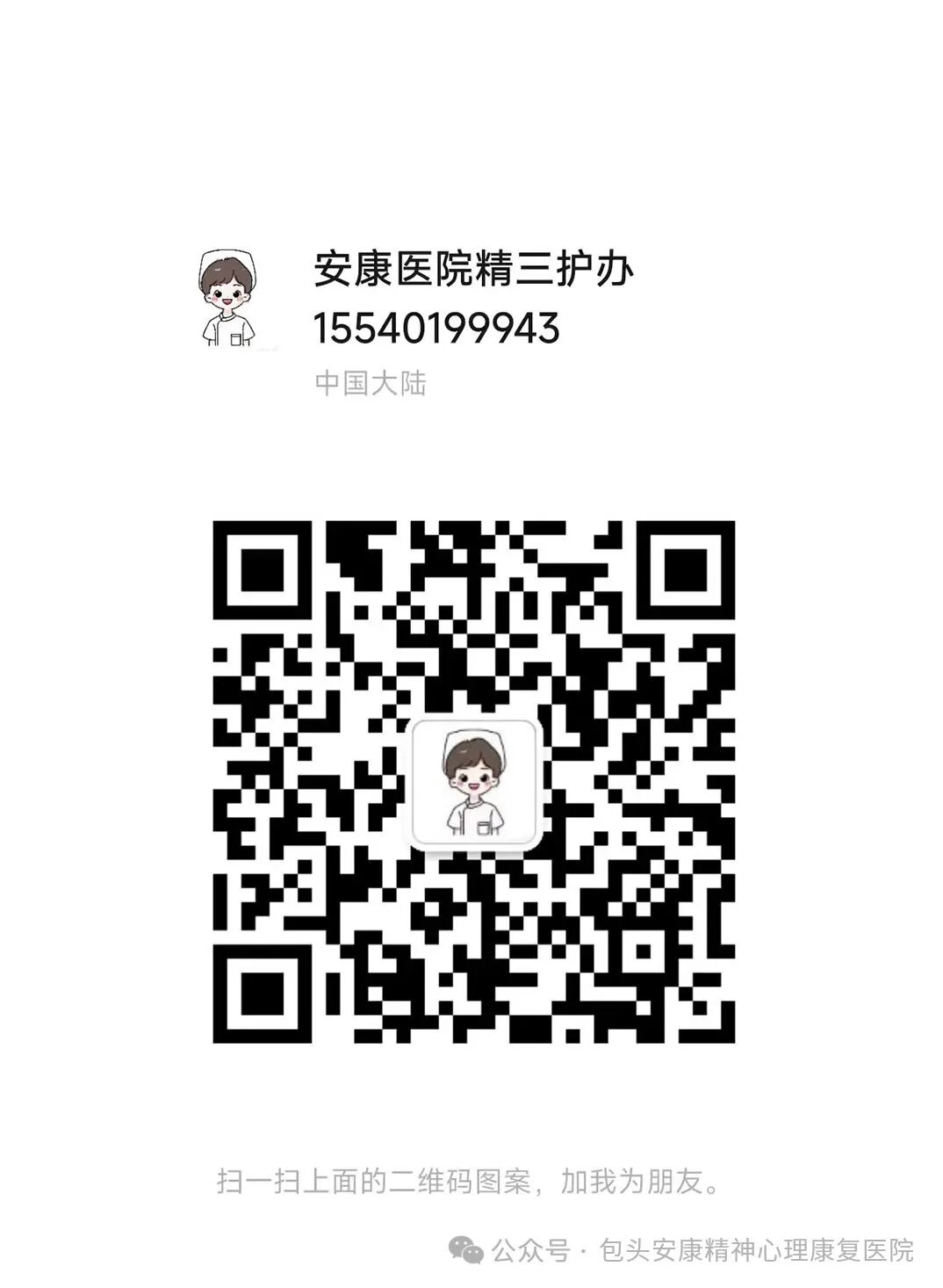 各位患者及家属,为了确保能及时、有效地与您沟通患者的病情和治疗情况,今后我院将使用公务号码与您联系,公务微信号以申请加您好友,若未收到好友请求,请主动搜索下面相应的号码,备注好为哪位患者的家属。同时公务号码之外的,其他任何声称来自我院的联系号码都与我院无关,以防您受到不必要的误导或干扰。感谢您的理解与配合,让我们共同为患者的健康努力。